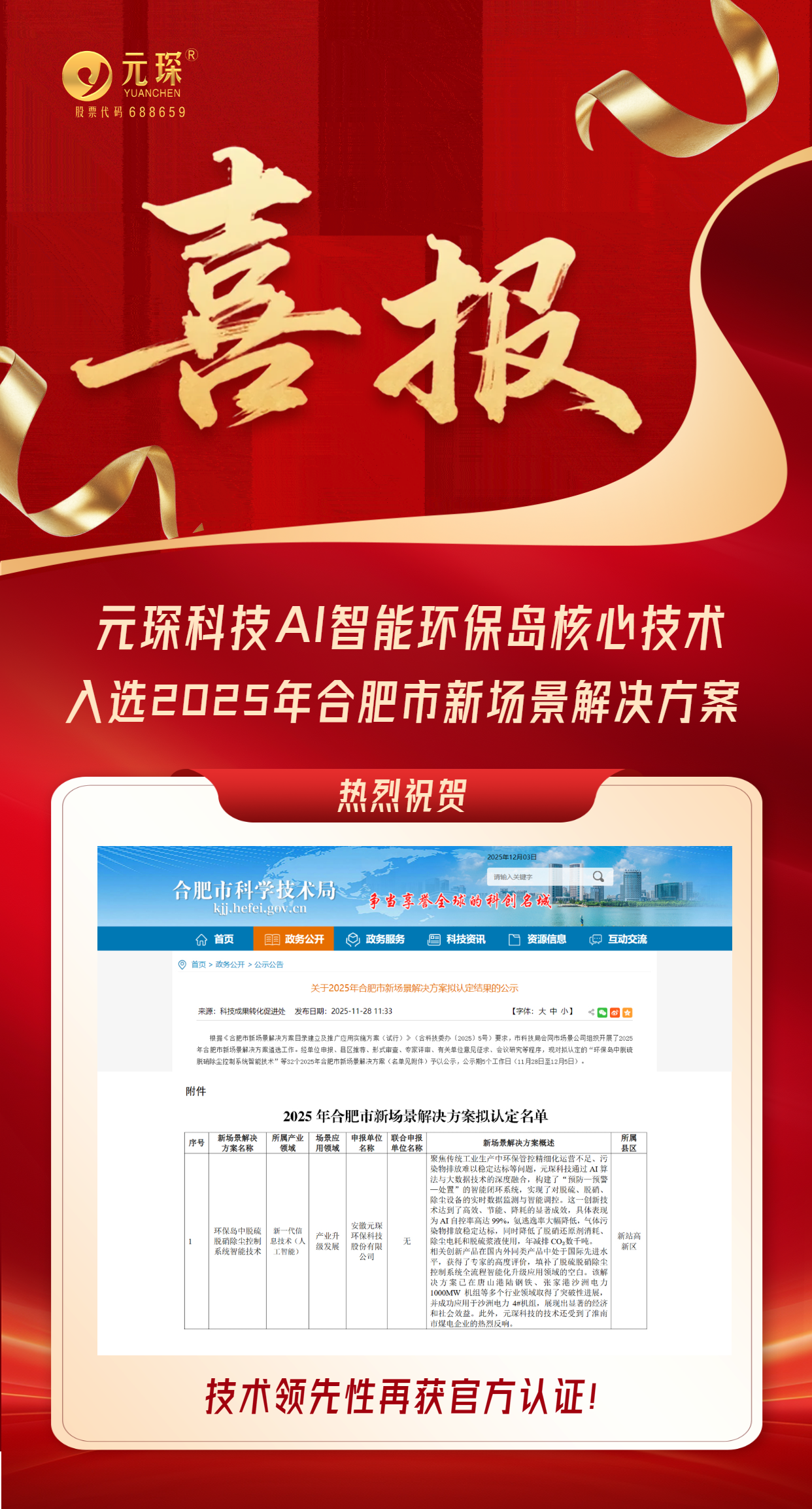 388vip太阳集团“环保岛中脱硫脱硝除尘控制系统智能技术”成功入选2025年合肥市新场景解决方案!